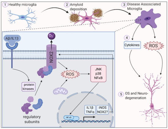 ROS is generated in microglia by activation of NADPH oxidase 2 along with deposition of amyloid plaques and inflammation leading to oxidative stress and neurodegeneration. Reproduced with permission from Simpson et al. [10].