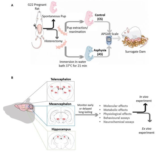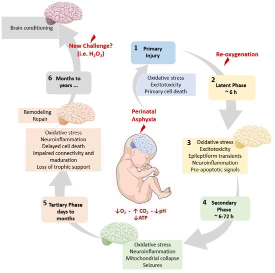 Interruption of oxygen transference leads to perinatal asphyxia (PA), a medical condition occurring at labor, delivery, and/or neonatal stages, affecting most of the infant’s organs, but the brain being the most concerned target. The incidence of PA is high; 2 to 10 per 1000 on term neonates [3], while is higher among premature deliveries [4,5,6]. Furthermore, the incidence of PA can be 5 times higher in developing- than in developed-countries [7], largely associated with prolonged labor and insufficient medical care [3]. If re-oxygenation is re-established, PA can lead to long-term consequences [8], including long-lasting neuropsychiatric dysfunctions when children reach critical developmental stages [9,10].