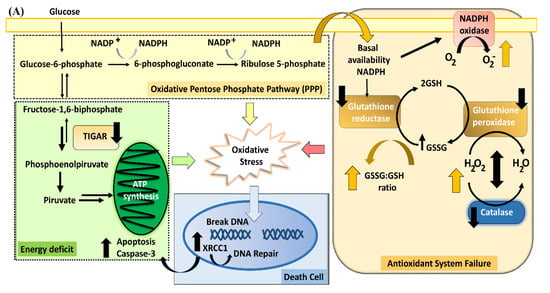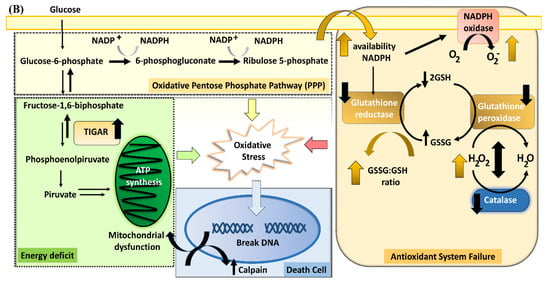 Figure 3 summarizes the consequences of oxidative stress and cell death triggered by PA in the hippocampus of a rat neonate. At P1 (A), the effect of PA is shown as promoting a down-regulation of TIGAR expression, favoring glycolysis, to compensate for the reduced ATP synthesis induced by PA. Consequently, only basal NADPH levels are available, together with the reduced enzymatic activity of GR, resulting in accumulation of GSSG, without any changes in GSH levels. Therefore, a decrease of glutathione-dependent enzymes is observed, including GPx, resulting in H2O2 accumulation, favored by reduced catalase activity. The reduced activity of antioxidant enzymes and the high GSSG:GSH ratio promote oxidative stress, causing DNA damage, DNA fragmentation, and activation of DNA repair mechanisms mediated by XRCC1 and PARP-1. At P14, after PA (B), there is an up-regulation of TIGAR expression, favoring the PPP to increase NADPH levels. Reduced enzymatic activity of GR is, however, observed, leading to accumulation of GSSG, suggesting that the NADPH produced by the PPP increases pro-oxidant pathways, such as NADPH oxidase, favoring ROS production, and inactivation of antioxidant enzymes by permanent oxidative stress, making insufficient the increased NADPH levels by the PPP. Consequently, GSH levels are reduced, as well as glutathione-dependent enzymes, such as GPx and catalase, showing reduced enzymatic activity, favoring the accumulation of H2O2. The oxidative stress produced by the reduced activity of antioxidant enzymes causes DNA fragmentation, without changes on XRCC1 expression and/or other sentinel proteins, leading to increased calpain-dependent cell death.