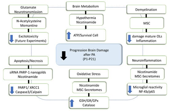 At present, the main therapeutic option against the long-term effects of PA is based on hypothermia, which provides protection only if initiated soon after the insult [188]. No consensus on clinical protocols has been achieved to date, and the advantages and disadvantages of head or whole-body cooling are still debated, including safety and developmental considerations [189,190,191,192,193]. The main drawback is the existence of a narrow therapeutic window [8,191,192]. The rationale of hypothermia is the graded reduction of cerebral metabolism, about 5% for every 1 °C of temperature reduction [194,195]. Cooling reduces post-depolarization release of excitatory amino acids by hypoxia-ischemia, both in the newborn [196] and adult [197] subjects. In a pioneering microdialysis experiment, Urban Ungerstedt and collaborators (1998) demonstrated in newborn piglets that hypothermia started immediately after hypoxia-ischemia was associated with reduced levels of excitatory amino acids and reduced NO efflux compared to the condition without hypothermia [198], supporting evidence that glutamate antagonists prevent events occurring during the early recovery phase following hypoxia-ischemia, before failure of mitochondrial function takes place. The effect of glutamate antagonists is however evident only when associated with hypothermia [75,199]. The team led by Alistair J Gunn and Joanne O Davidson has recently reported a very authoritative opinion on the challenges of developing therapeutic strategies for neonatal encephalopathy [193]. Here, we focus, however, on therapeutic strategies investigated and/or discussed by our studies.