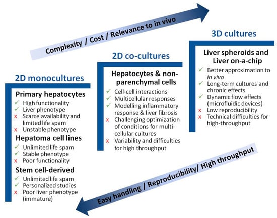 Single-cell in vitro models fail to accurately recapitulate the pathological mechanisms of liver diseases. Therefore, more physiologically relevant models such as cocultures or 3D systems have been developed.