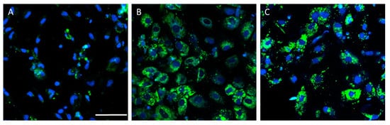 Drug-induced lipid accumulation in the hepatocyte-like cells (HLCs) derived from induced-pluripotent stem cells (iPSCs) from a healthy donor. Representative images of untreated HLCs (A), and HLCs treated with valproate (B) or amiodarone (C), are also shown. Nuclei were stained with Hoechst 33342 (blue) and neutral lipids with BODIPY 493 (green). Scale bar (50 µm) applies to all images.