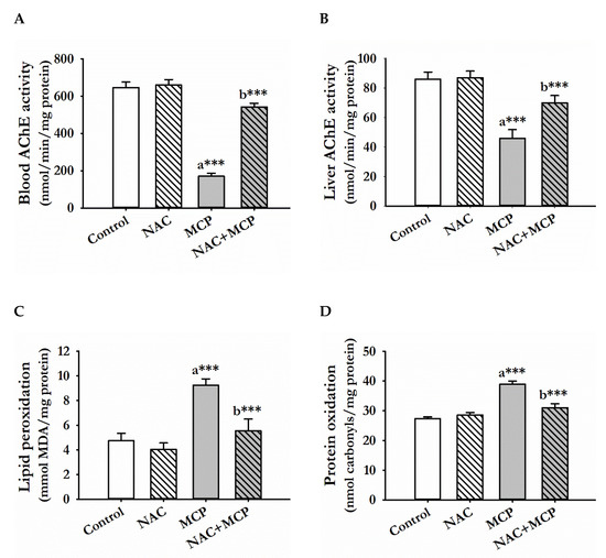 NAC pre-treatment restored AChE activity and prevented oxidative stress in the liver of MCP-exposed rats. (A,B) Enzymatic activity of AChE in the serum and liver tissue, (C) levels of MDA and (D) carbonyl content in the liver tissue of the different experimental groups. The values represented are mean ± S.D. (N = 5). a as compared to the control group; b as compared to MCP-exposed group. *** p < 0.001, significantly different.