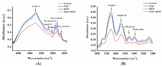 NAC pre-treatment restores MCP exposure-induced structural alterations in rat liver.The FTIR spectra are representing the selected wavenumber range of (A) region 3700 to 2750 cm−1; (B) region 1800 to 1200 cm−1. The spectra are representative of N = 3.