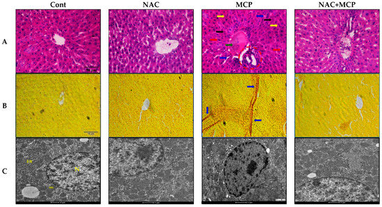Photomicrograph of the liver tissue sections. (A) H and E staining (200*); circle indicates the area of inflammation and infiltrated cells; black arrows indicate pyknotic nuclei; blue arrows depict sinusoidal space; yellow arrows depict activated kuffer cells; green arrow indicates congestion of central vein; red arrows indicate apoptotic hepatocytes. (B) Van Geison’s staining (200*); arrows depict the fibrosis. (C) Transmission electron microscopy images; N—nucleus, ER—endoplasmic reticulum, mt—mitochondria.