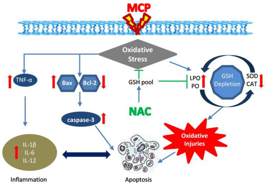 It has been demonstrated that inflammatory cytokines are involved in the progression of oxidative stress. The cytokines TNF-α, IL-1β, IL-6 and IL-12 are directly associated with free radical-mediated oxidative stress [89]. TNF-α is a prime pro-inflammatory cytokine that initiates a cascade of reactions via the upregulation of IL-1 and IL-6 levels resulting in multiple organ injuries. In the present study, MCP treatment significantly upregulated TNF-α, IL-1β, IL-6 and IL-12 cytokines level, while the NAC pretreatment downregulated their levels, suggesting the potential anti-inflammatory properties of NAC in MCP-exposed rats.