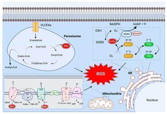 The endoplasmic reticulum (ER) is a fine network of tubules that performs many versatile functions in the cell []. The ER produces a vast majority of all proteins secreted into the extracellular space, including hormones and cytokines, as well as cell surface receptors and other proteins that interact with the environment []. In the ER, the catalytic processes of oxidoreductase Ero1 and NADPH oxidase (NOX) produce ROS.