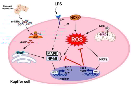 In the antioxidant system, antioxidant proteins and phase II detoxification enzymes (heme oxygenase-1 (HO-1) and NADPH-quinone oxidoreductase-1 (NQO1)) are key protective agents against oxidative damage []. Studies have found that the upregulation of HO-1 induced by ethanol involves the activation of JNK-1, hypoxia-inducible factor (HIF)-1α and NRF2, but the expression of NQO1 is only regulated by NRF2 []. By upregulating antioxidant genes, NRF2can also protect the liver from inflammation in a ROS-dependent manner []. Although NRF2 is elevated under external stimulation, it is downregulated in NASH patients []. A recent study determined that inflammation and metabolic deterioration were aggravated in a myeloid-specific NRF2-deficient NASH mouse model []. In another study, LPS accelerated the inflammatory response in P62 and NRF2-double knockout KCs []. The antioxidant system is indispensable for the inflammatory responses of KCs (Figure 3). This system balances the redox state and alleviates the inflammatory responses mediated by ROS.