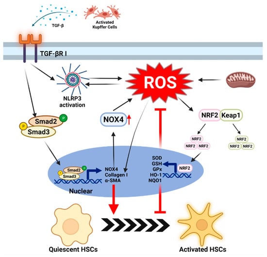 OS results from the alteration of the oxidation and antioxidant balance and involves changes in ROS and RNS levels. ROS not only increase hepatocyte metabolism disorders and KC activation but also stimulates the production of collagen I, which is a key intracellular signaling mediator in the TGF-β-driven fibrosis []. TGF-β is an important cytokine that induces the activation of HSCs. Under normal conditions, TGF-β participates in wound healing and angiogenesis. However, excess TGF-β is released from damaged hepatocytes and pro-inflammatory KCs [,]. This released TGF-β is recognized by the TGF-βRI receptor on the HSCs and increases fibrogenesis via the SMAD2/3 pathway []. In this process, phosphorylated SMAD 2/3 also activates the expression of NOX4 [,]. Interestingly, NOX enzyme complexes and the mitochondria are the main producers of endogenous ROS []. Moreover, studies have found that the expression of NOX4 is upregulated in many fibrosis models []. NOX4 knockdown reduces the activation of HSCs without affecting the expression of the TGF-β1 receptor and the phosphorylation of SMAD2, which indicates that NOX4-mediated ROS occur downstream of the TGF-β1 and SMAD complex []. The downregulation of HSC activation depends largely on the lack of NOX4 (which indicates a lack of excessive ROS). In addition to NOX4, NOX1 and NOX2 are also expressed in HSCs. The depletion of NOX1 or NOX2 can reduce inflammation and fibrosis caused by carbon tetrachloride (CCl4) and bile duct ligation (BDL) [,]. In contrast, NOX4 does not need to recruit cytoplasmic structural subunits to form active enzymes to generate ROS []. This implies that NOX4 produces ROS more rapidly than NOX1 and NOX2. Surprisingly, H2O2 and other ROS can directly induce collagen α1 activity [,]. Therefore, OS due to ROS plays a key role in TGF-β-mediated fibrogenesis in HSCs (Figure 4).
