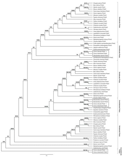 - Delsuc, F.; Brinkmann, H.; Chourrout, D.; Philippe, H. Tunicates and not cephalochordates are the closest living relatives of vertebrates. Nature 2006, 439, 965–968. [Google Scholar] [CrossRef]