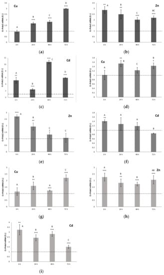 Relative expression levels (fold induction, f. i.) of Cr-Prdx2 (a-c), Cr-Prdx3 (d-f) and Cr-Prdx3 (g-i), during Cu, Zn and Cd exposure. Values are indicated as mean ± SD. Transcription levels were normalized with respect to controls (dashed line). Asterisks: significant differences with respect to controls (*** p < 0.001, ** p < 0.01, * p < 0.05). Different letters correspond to significant statistical differences (p < 0.05) among different treatment times (Duncan’s test).