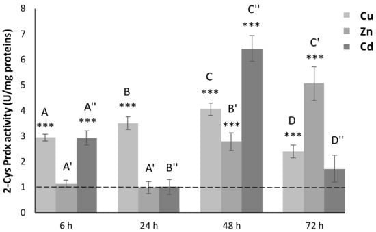 Additionally, Cu induces an increase in the transcription for all the three Cr-Prdx isoforms, particularly Cr-Prdx2, even if in a less marked way than Cd. This was a partly unexpected result considering the redox properties of Cu, which catalyzes Haber–Weiss and Fenton reactions leading to hydroxyl radicals (•OH) formation among the most active ROS [61]. A consistent increase in the enzymatic activity in comparison to controls was revealed during the time course. We hypothesize that the mRNA for the three Cr-Prdx isoforms was readily translated into active protein when the intracellular concentration of Cu increased, also increasing the risk of oxidative stress. The metal accumulation reaches its maximum at 72 h, when we detect the maximum mRNA expression for Cr-Prdx2 and Cr-Prdx4. This physiological response seems justified by the fact that the Cu is an essential metal, so it can only damage the cell when its concentration increases beyond a threshold.