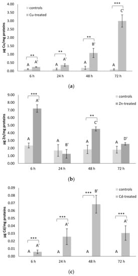 Instead, in the cell-free extracts of organisms exposed to Zn, significant variations in concentrations of this metal emerged only at 6 and 48 h, with values three and two times higher (p < 0.001) than in the controls, respectively (Figure 4b). These peaks of accumulation were interspersed with times when the Zn concentration was quite similar to that measured in the untreated specimens.