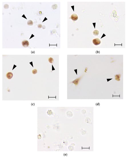 ISH with anti-sense riboprobes for (a) cr-Prdx2, (b) cr-Prdx3 and (c,d) cr-Prdx4, and sense riboprobe, for (e) cr-Prdx4 as reference, on hemocyte monolayers from three-day Cd treatment. Brown color: riboprobe staining. Arrowheads: labeled hemocytes. Scale bar: 10 µm.