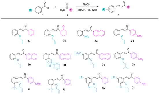 Synthesis of CAH derivatives (α,β-unsaturated ketones) from Claisen–Schmidt condensation of oxygenated acetophenones. Substrate scope and structures of CAH derivatives (3a–3l) are shown in the lower panel.