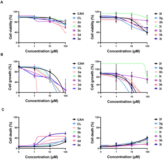 In vitro efficacy of CAH derivatives 3a–3l using therapeutic indices in SW10 cells treated with 1–100 µM of each compound for 10 h. (A) Dose–effect curve plot of 3a–3l indicated the cell viability of SW10 cells. (B) Cell growth curves of 3a–3l representing inhibition of cell proliferation were determined by the MTS assay in a dose-dependent manner. (C) Cell death was calculated as a ratio of live cells over dead cells via trypan blue exclusion assay. All CAH derivatives showed no in vitro efficacy in concentrations of ≤100 nM and 100% cell death in the concentration of 1 mM, respectively. CAH, cinnamaldehyde. CL, chalcone.