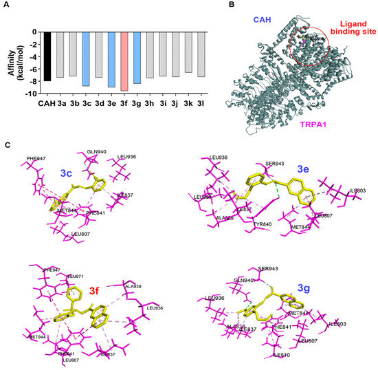 Docking-simulation results between TRPA1 and CAH derivatives. (A) The binding affinity energies (kcal/mol) of 3a−3l with TRPA1 were estimated by AutoDock Vina software. (B) Three-dimensional structure of TRPA1 (PDB code: 6X2J) was used from the Protein Data Bank database (https://www.rcsb.org/; accessed on 10 March 2022). (C) Docking conformations of 3c, 3e, 3f, and 3g showing high affinity with TRPA1 were visualized, and the zoom-in view of each docked ligand inside the TRPA1 was displayed. The structure of ligands was represented as yellow, the residues in the ligands were indicated as pink, and predicted hot spots were shown as blue. CAH, cinnamaldehyde.