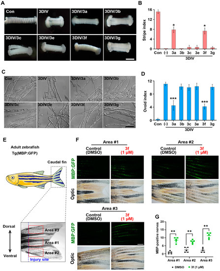 Ex vivo and in vivo efficacy of CAH derivatives against PND. (A) Sciatic nerve explant culture was used for evaluating ex vivo efficacy. Transverse stripes of sciatic nerve explants in the presence or absence of compounds of 100 µM were observed and photographed under a stereomicroscope for three days in vitro (3DIV). Scale bar, 50 µm. The compounds were 3a, 3b, 3c, 3e, 3f, and 3g. (B) The number of transverse stripes in a 2 mm-long sciatic nerve was defined as stripe index and measured by counting under a stereomicroscope (n = 3 mice). (C) Ovoid-shaped myelin formation appeared in the sciatic nerve fibers cultured for 3DIV with or without treatment of the compounds. (D) The ovoid index was obtained by counting the ovoid-shaped myelin in 200 µm-long sciatic nerve fibers under a differential interference contrast (DIC) filtered microscope. Scale bar, 50 µm. (E) In vivo PND model using [Tg(mbp:eGFP)] zebrafish are visualized. (F) MBP: eGFP fluorescence in the caudal fin (green) with 3f treatment of 1 µM for 10 days was observed under a stereomicroscope. Scale bar, 0.25 mm. (G) The number of intact GFP fluorescence was counted in three areas (1 × 1 mm2) of the distal part of the injury. * p < 0.05, ** p < 0.01, and *** p < 0.001.