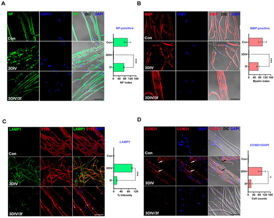 To determine whether Schwann cells are targeted by 3f, we performed an immunochemical analysis of the biomarkers of PND. Degenerating nerve fibers show axon degradation and Schwann cell demyelination, proliferation, and dedifferentiation [37,38]. These are regulated in or by Schwann cells during PND. NF is an axon marker [39], and we performed immunostaining for NF in sciatic nerve samples to assess the inhibitory effect of 3f on axonal degradation. Moreover, 3f maintained NF structures in nerve fibers (Figure 5A). MBP is a marker of myelination/demyelination in Schwann cells [39]. At 3DIV, 3f is protected against myelin sheath breakdown by Schwann cells during PND (Figure 5B). LAMP1 is a lysosomal membrane protein and a marker of Schwann cell dedifferentiation [39]. At 3DIV, 3f-treated nerve fibers showed suppressed LAMP1 expression in Schwann cells compared with untreated nerve fibers (Figure 5C). Lastly, we performed immunostaining using a CCND1-specific antibody as a marker of cell proliferation [39]. Here, 3f inhibited Schwann cell proliferation (Figure 5D). Therefore, 3f inhibited the Schwann cell phenotypes and could be a lead compound having therapeutic potential for PND in vitro, ex vivo, and in vivo.