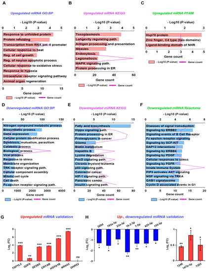 Next, 21 DE miRNAs, comprising 11 upregulated and 10 downregulated miRNAs, were obtained [21]. GO term analysis classified the 21 miRNAs into the top 15 GO functional terms according to their P-values. The genes targeted by the miRNAs were significantly abundant in the biological processes; cellular nitrogen compound metabolic process, catabolic process, response to stress, and mitotic cell cycle (Figure 6D and Figure S5A). Most of the top 15 representative KEGG pathways were related to Schwann cell proliferation, myelination and differentiation, fatty acid biosynthesis, and the FoxO, insulin, mTOR, and Hippo pathways [42,43,44] (Figure 6E and Figure S5B). The top 15 Reactome also highlighted Schwann cell proliferation, differentiation, and myelination, signaling by ERBB2, signaling by PDGF, PIP3 activating AKT signaling, and cyclin D-associated events in G1 [45,46,47] (Figure 6F and Figure S5C). Cell components and molecular function using DE miRNAs in GO terms were also enriched (Figure S6). Collectively, CAH affects cell proliferation, cell differentiation, and the response to oxidative stress at transcriptional or post-transcriptional levels.