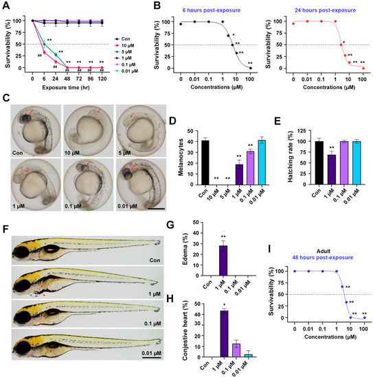 Zebrafish embryos (4 h post-fertilization) were exposed to 3f (final 0.01 to 10 µM). After waterborne exposure of embryos to a solution containing 3f for 120 h, live embryos were observed under an SMZ800 stereomicroscope and photographed using a DIGITAL SIGHT DS-Fi3 (Nikon, Tokyo, Japan) every 24 h. In brief, three sets of 25 embryos per each set were morphologically evaluated for up to 120 h during the method based on the criteria in the previous report [23]. Larvae with no movement to the touch were considered dead. The number of deaths (lethal endpoints) and sublethal effects were used to calculate the LC50.