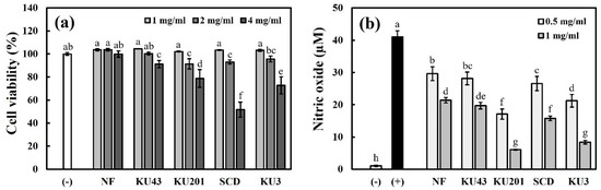 Cell viability and nitric oxide (NO) production in RAW 264.7 cells: (a) cell viability; (b) production of cellular NO. (−): negative control without lipopolysaccharide (LPS); (+): positive control with LPS; NF: nonfermented hydroponic ginseng (HG); KU43: HG fermented with B. subtilis KU43; KU201: HG fermented with B. subtilis KU201; SCD: HG fermented with B. polyfermenticus SCD; KU3: HG fermented with B. polyfermenticus KU3. The data are represented as means ± standard deviations of triplicates. Statistical differences (p < 0.05) are represented with different letters above error bars.