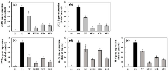 Relative gene expression levels of inflammation mediators in RAW 264.7 cells: (a) inducible nitric oxide synthase (iNOS); (b) cyclooxygenase-2 (COX-2); (c) tumor necrosis factor (TNF)-α; (d) interleukin (IL)-1β; (e) interleukin IL-6. (−): negative control without lipopolysaccharide (LPS); (+): positive control with LPS; NF: nonfermented hydroponic ginseng (HG); KU201: HG fermented with B. subtilis KU201; SCD: HG fermented with B. polyfermenticus SCD; KU3: HG fermented with B. polyfermenticus KU3. The data are represented as means ± standard deviations of triplicates. Statistical differences (p < 0.05) are represented with different letters above error bars.
