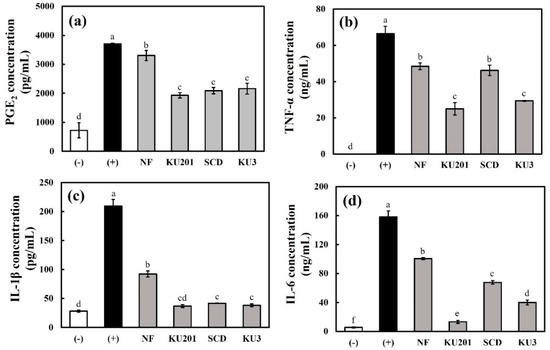 Protein concentrations of inflammatory cytokines in RAW 264.7 cells: (a) prostaglandin E2 (PGE2); (b) tumor necrosis factor (TNF)-α; (c) interleukin (IL)-1β.; (d) interleukin IL-6. (−): negative control without lipopolysaccharide (LPS); (+): positive control with LPS; NF: nonfermented hydroponic ginseng (HG); KU201: HG fermented with B. subtilis KU201; SCD: HG fermented with B. polyfermenticus SCD; KU3: HG fermented with B. polyfermenticus KU3. The data are represented as means ± standard deviations of triplicates. Statistical differences (p < 0.05) are represented with different letters above error bars.