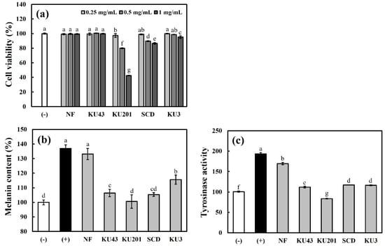 Cell viability, cellular melanin content, and cellular tyrosinase activity in B16F10 cells: (a) cell viability; (b) melanin content; (c) tyrosinase activity. (−): negative control without α-melanocyte-stimulating hormone (α-MSH); (+): positive control with α-MSH; NF: nonfermented hydroponic ginseng (HG); KU43: HG fermented with B. subtilis KU43; KU201: HG fermented with B. subtilis KU201; SCD: HG fermented with B. polyfermenticus SCD; KU3: HG fermented with B. polyfermenticus KU3. The data are represented as means ± standard deviations of triplicates. Statistical differences (p < 0.05) are represented with different letters above error bars.