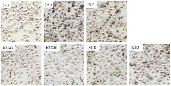 L-3,4-dihydroxyphenylalanine (L-DOPA) staining in B16F10 cells. (−): negative control without α-melanocyte-stimulating hormone (α-MSH); (+): positive control with α-MSH; NF: nonfermented hydroponic ginseng (HG); KU43: HG fermented with B. subtilis KU43; KU201: HG fermented with B. subtilis KU201; SCD: HG fermented with B. polyfermenticus SCD; KU3: HG fermented with B. polyfermenticus KU3.