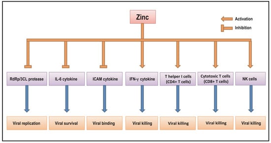 It has been noted that these novel coronaviruses may inhibit the early immune defense system with anti-viral innate cytokines in the body through a viral immune evasion mechanism by the downregulation of MHC molecule expression and inhibition of MHC molecule recognition. This would induce unlimited virus replication cycle and infection amplification, which entails an over-active immune response and the delayed and substantially sustained activation of inflammatory cytokine/chemokine responses at the later stage, eventually causing hyper-inflammation, cytokine storm, and viral sepsis in severe or critical conditions of the patients with novel coronavirus infections [13,29,30,31]. Early and sufficient control of viral replication and pathogen elimination by an innate and adaptive immune system in the body would be a potential target of therapeutic intervention for the prevention/treatment of COVID-19 infection. Zinc is a known immune modulator and can act as an anti-inflammatory and anti-oxidant agent in humans. Several clinical trials indicate that zinc treatment reduces the symptoms and duration of acute respiratory infections in humans. These data suggest that zinc may have a great implication in COVID-19. We will discuss more details of zinc and COVID-19 later in Section 5, Section 6, Section 7 and Section 8.