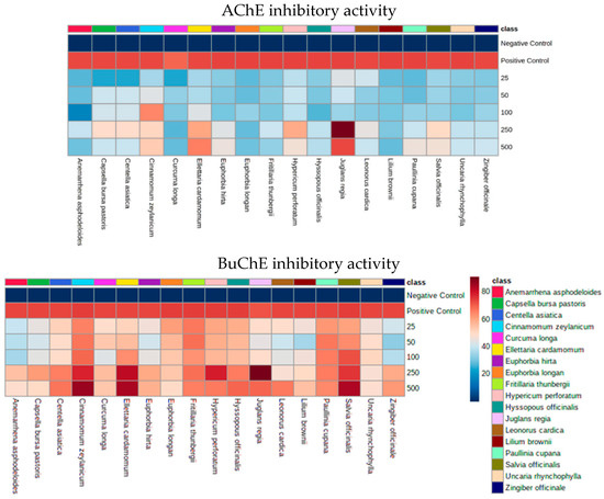 Concentration-dependent effects of plant extracts on acetylcholinesterase (AChE) and butyrylcholinesterase (BuChE) and inhibitory activities. A total of 18 plant extracts were screened using both AChE and BuChE inhibitory assays. Di-nitro-thiobenzoate was added to wells of a 96-well plate, followed by either acetylthiocholine iodide (ATCI) or butyrylthiocholine chloride (BTCC) as substrates. Phytoextracts were tested in duplicate at concentrations ranging from 25–500 µg/mL. Mean percentage inhibition data is summarised in the heatmaps. Positive control: galantamine (18 µM in AChE experiments or 2 µM in BuChE experiments); negative control: sodium phosphate buffer.