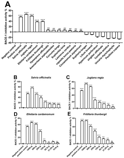 β-secretase (BACE-1) inhibitory activity of plant extracts. (A) Plant extract (n = 18) concentrations were initially screened at a concentration of 500 µg/mL; (B–E) the concentration-dependent activities (15.6–1000 µg/mL) were then determined for four selected phytoextracts, i.e., S. officinalis, J. regia, E. cardamomum, and F. thunbergii. The inhibitory activity was determined by using a standardised BACE-1 Activity Detection Kit, with KF-14 (25 µM) used as a positive control. * p < 0.05, ** p < 0.01, and *** p < 0.001 compared with negative control (vehicle control, i.e., 1% DMSO in ddH2O). ns (not significant).
