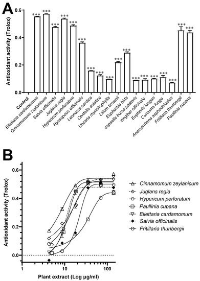 Plants extracts (n = 18, 140 µg/mL) were screened for their antioxidant activity. All exhibited some degree (p < 0.001) of antioxidant activity (Figure 3A), but the seven plant extracts (n = 7) that elicited the greatest antioxidant activity in a concentration-dependent manner (4.3–140 µg/mL) based on their IC50 values were: C. zeylanicum, J. regia, H. perforatum, P. cupana, E. cardamomum, S. officinalis, and F. thunbergii. Indeed, at a concentration of 140 μg/mL, they exerted an activity (expressed as Trolox equivalents) of 0.57 ± 0.01 mM, 0.55 ± 0.001 mM, 0.53 ± 0.003 mM, 0.48 ± 0.004 mM, 0.47 ± 0.004 mM, 0.45 ± 0.01 mM, and 0.43 ± 0.01 mM, respectively (Figure 3B).