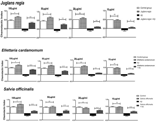 The concentration-dependent effects of the selected medicinal plant extracts (n = 5, 10–100 µg/mL) on the chemotaxis index (CI), both in the presence and absence of Aβ (100 μM), are shown in Figure 4.