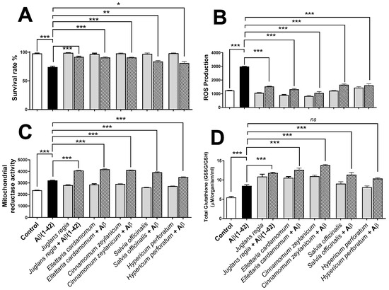 Evaluating the ability of plant extracts to ameliorate the effects of amyloid beta Aβ (1-42) in Globodera pallida. (A) Percentage survival of G. pallida was determined by visual counting of living/dead organisms following exposure to Aβ (1-42) alone, plant extracts, or plant extracts in combination with Aβ (1-42). (B) ROS production was monitored using the DCFH-DA assay, and the fluorescence (Ex: 495 nm/Em: 529 nm) was measured every 30 min for 24 h; the results are reported as areas under the curve (AUC). (C) For mitochondrial reductase activity, G. pallida were incubated with Alamar Blue, and the fluorescence (Ex: 530 nm/Em: 590 nm) was measured every 30 min for 24 h. The results are reported as AUC. (D) Total glutathione is the ratio of oxidized glutathione (GSSG) to reduced glutathione (GSH), which is a measure of cellular oxidative stress. It was determined by employing OxiSelect™ Total Glutathione assay in the presence of nicotinamide adenine dinucleotide phosphate (NADPH) at 405 nm. The total glutathione content in unknown samples is determined by comparison with the predetermined glutathione standard curve. In each type of experiment, the nematodes were exposed to Aβ (1-42) alone (100 µM), plant extracts (n = 5; 100 µg/mL), or plant extracts (n = 5; 100 µg/mL) in combination with 100 µM Aβ (1-42). Control represents untreated cells (vehicle control); heat-killed G. pallida (not shown) were also performed as controls. Approximately 50 G. pallida J2 organisms per replicate were used in survival assays, ~100 organisms were used in mitochondrial reductase and ROS assays, and glutathione studies involved ~1000 organisms per replicate. Data are mean ± SEM (n = 3), * p < 0.05, ** p < 0.01, *** p < 0.001 (significance), and ns (not significant) for the statistical comparisons indicated (one-way analysis of variance).