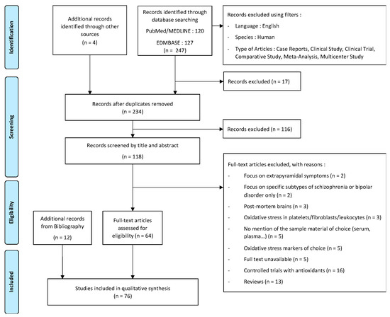 An initial general search was performed using two databases PubMed and EMBASE. We used the keywords: (“schizophrenia” OR “psychosis”) AND (“antioxidant” OR “oxidative stress”). The initial search screened titles and abstracts only. The limits used were the date of publication (from 1991 to 2022), the species studied (humans) and the language (English). Additional records were identified through other sources.