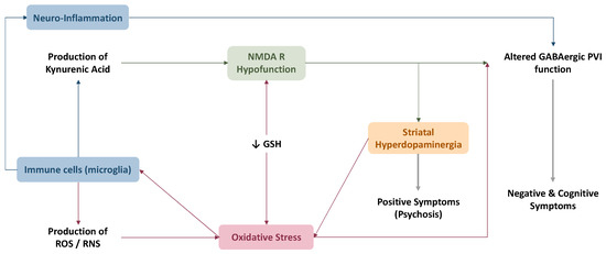 - Steullet, P.; Cabungcal, J.H.; Monin, A.; Dwir, D.; O’Donnell, P.; Cuenod, M.; Do, K.Q. Redox dysregulation, neuroinflammation, and NMDA receptor hypofunction: A “central hub” in schizophrenia pathophysiology? Schizophr. Res. 2016, 176, 41–51. [Google Scholar] [CrossRef]
