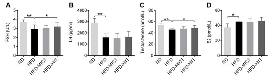HFD feeding caused significant decreases in serum FSH, LH and testosterone levels, and significant increases in E2 levels compared with the ND group (Figure 3A–D). After 8 weeks of HIIT, serum FSH and testosterone levels showed a significant recovery, but these changes did not occur in the HFD-MICT group (Figure 3A,C). MICT and HIIT had no effect on serum E2 and LH levels (Figure 3B,D).