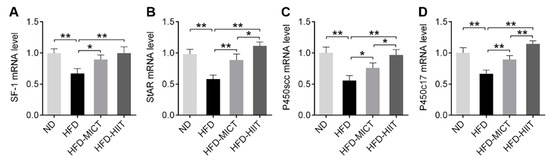 We analyzed the mRNA expression of steroidogenic enzymes, including SF-1, StAR, P450scc and P450c17. We found that the mRNA levels of SF-1, StAR, P450scc and P450c17 in testes were decreased by HFDs. MICT and HIIT treatment significantly reversed these effects (Figure 4A–D). Moreover, the mRNA levels of StAR, P450scc and P450c17 in the HFD-HIIT group were higher than those in the HFD-MICT group (Figure 4B–D).