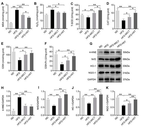 Effects of MICT and HIIT on testicular oxidative stress in obese mice. The activities of (A) MDA, (B) H2O2, (C) T-SOD, (D) CAT, (E) GSH and (F) GSH-Px in mouse testes. (G–K) Protein levels of 4-HNE, Nrf2, HO-1 and NQO-1 were detected by Western blot. Data are expressed as mean ± SEM. * p < 0.05, ** p < 0.01.