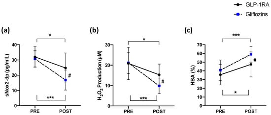 Figure 1. (a) Serum soluble NOX2-derived peptide (sNOX2-dp), (b) serum H2O2, and (c) blood HBA before and 15 days after administration of GLP-1RA (n = 16) or gliflozins (n = 16). Data are expressed as mean ± SD. Intra-group significance: * p < 0.05; *** p < 0.0001; inter-group significance: # p < 0.05.