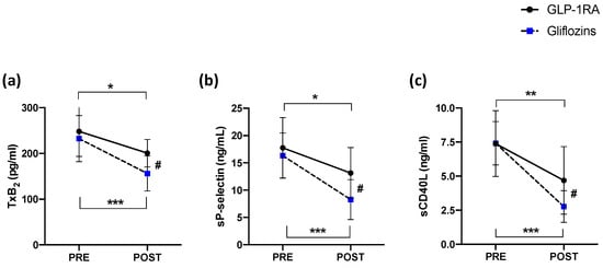 Figure 2. (a) Thromboxane B2 production, (b) soluble P-selectin levels and (c) soluble CD40 ligand before and 15 days after administration of GLP-1RA (n = 16) or gliflozins (n = 16). Data are expressed as mean ± SD. Intra-group significance: * p < 0.05; ** p < 0.001; *** p < 0.0001; inter-group significance: # p < 0.05.