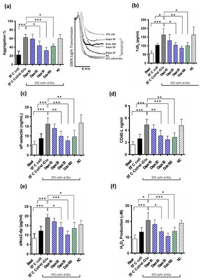 Figure 4. (a) Platelet aggregation and representative aggregometer trace, (b) Thromboxane B2 production, (c) soluble P-selectin levels, (d) soluble CD 40 ligand, (e) serum soluble NOX2-derived peptide (sNOX2-dp), (f) serum H2O2 in washed platelets (wPLTs) taken from HS (n = 5) pre-incubated with or without d-Glucose (d-Glu, 10 mM) and then stimulated with or without STC of collagen (0.25 μg/mL) in the presence or less of dapagliflozin (Dapa, 30 µM) or dulaglutide (Dula, 100 nmol/L) or negative control (NC). Data were expressed as mean ± SD; * p < 0.05, ** p < 0.01; *** p < 0.001.