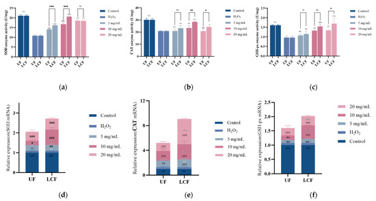 3.7. Effects of UF and LCF on Antioxidant Enzyme Content and mRNA Expression