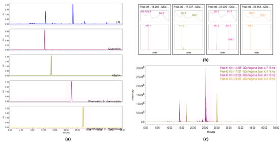 Four flavonol rhamnosides, quercitrin, afzelin, rhamnetin 3-rhamnoside, and rhamnocitrin 3-rhamnoside, from LTE were measured at a wavelength of 245 nm and detected at approximately 14.3, 17.0, 25.2, and 29.9 min, respectively (Figure 1a). Their molecular weights, 447.15, 431.18, 461.15, and 445.18 m/z were detected in negative mode, respectively (Figure 1b,c).