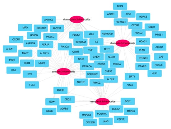 Network of four molecules (pink oval) and 70 potential target genes (cyan rectangles); this network consisted of 74 nodes and 160 edges.
