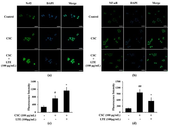 A greater translocation of Nrf2 into nuclei was observed in CSC exposed H292 cells in comparison to that in non-treated cells (Figure 6a,c). LTE treatment further increased Nrf2 translocation into the nucleus in CSC exposed H292 cells. The translocation of NF-κB also increased into the nuclei of CSC exposed H292 cells compared with that in non-treated cells (Figure 6b,d). However, LTE treatment noticeably decreased the translocation of NF-κB into nuclei when induced by CSC.