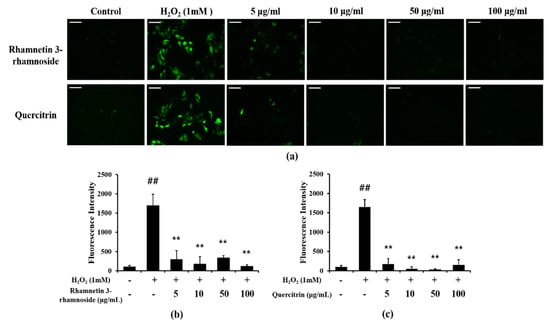 To measure ROS production, HeLa cells (3 × 105/well, ATCC) were treated with rhamnetin 3-rhamnoside (5, 10, 50 and 100 μg/mL) and quercitrin (5, 10, 50 and 100 μg/mL). After incubation for 6 h, cells were treated with H2O2 (1 mM) for 45 min. Additionally, then cells were stained with 2′,7′-dichlorodihydrofluorescein diacetate (10 μM, DCFDA, Sigma-Aldrich, Saint Louis, MO, USA) for 45 min. The images were acquired on a confocal laser scanning microscope (LMS900, ZEISS).