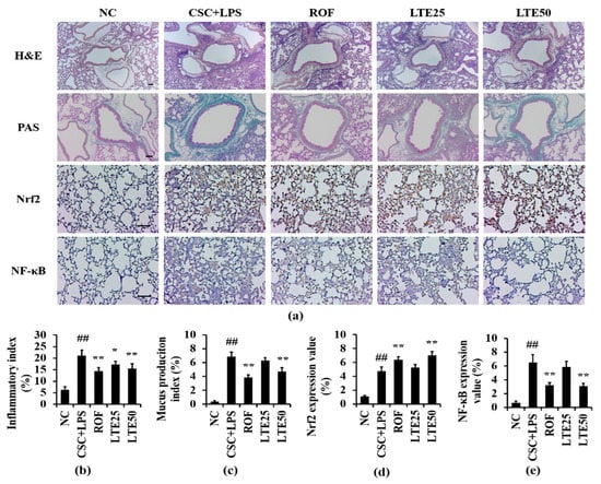 CSC+LPS exposure to mice induced the recruitment of inflammatory cells and mucus production into lung tissue. Roflumilast-treated mice showed the marked reduction in inflammatory response and mucus production compared with the CSC+LPS exposed mice. The LTE treatment reduced the inflammatory response and mucus production caused by CSC+LPS exposure (Figure 9a–c). Although there is no significant difference between ROF group and LTE groups, ROF group slightly more decreased mucus production than LTE groups. The expression of Nrf2 on lung tissue increased to a greater extent in Roflumilast and LTE-treated mice with CSC+LPS exposure than that in CSC+LPS exposed mice (Figure 9a,d). In contrast, the administration of Roflumilast and LTE clearly reduced the expression of NF-κB on lung tissue owing to CSC+LPS exposure (Figure 9a,e).